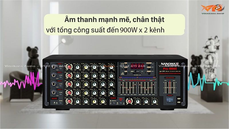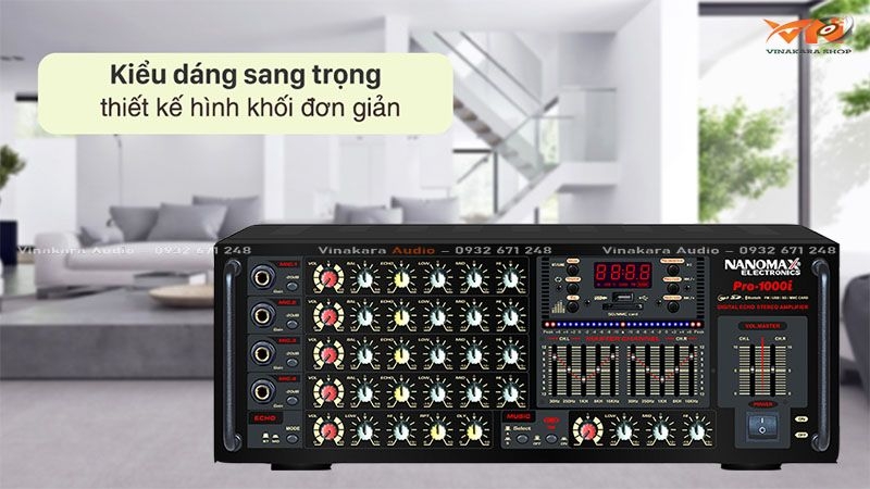 Amply Nanomax Pro-1000i được thiết kế sang trọng sẽ giúp cho không gian âm nhạc của gia đình, cũng như hệ thống âm thanh karaoke, sân khấu trở lên cuốn hút và trang trọng hơn.