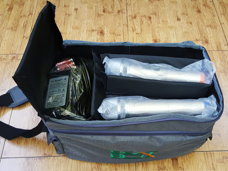 - Thời gian dùng bình tương đối dài tầm 4 – 6 tiếng và có thể sử dụng điện trực tiếp, đi kèm với đó là 1 cặp micro không dây chuẩn UHF chuyên nghiệp.