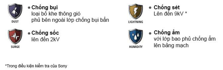 - Chế độ bảo vệ Sony X-Protection PRO góp phần hạn chế tác động của bụi ẩm, sấm sét, độ ẩm, sốc điện. Tuy nhiên, tính năng này chỉ hạn chế, chứ không đảm bảo sẽ ngăn chặn 100% các tác động trên.