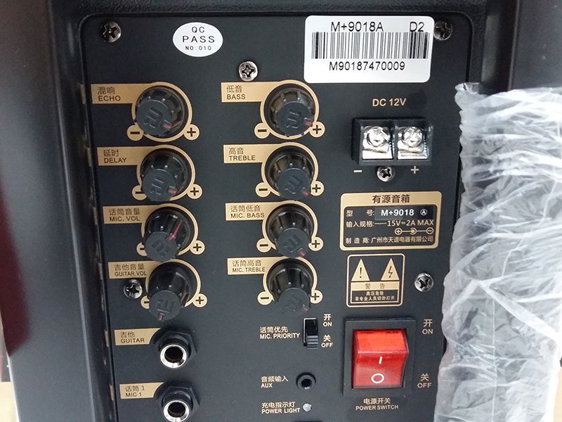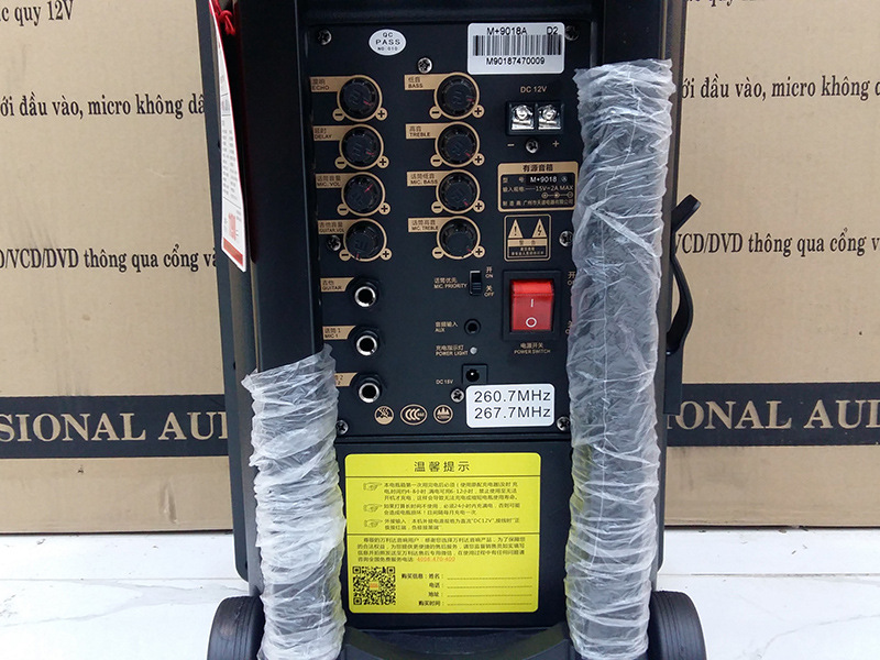 - Mặt sau của loa là phần điều chỉnh âm thanh của nhạc và micro được chia làm 2 cột với những tính năng hoàn toàn khác nhau, bên trái là chỉnh hiệu ứng âm thanh của micro và bên phải là treble, bass của loa lẫn micro.