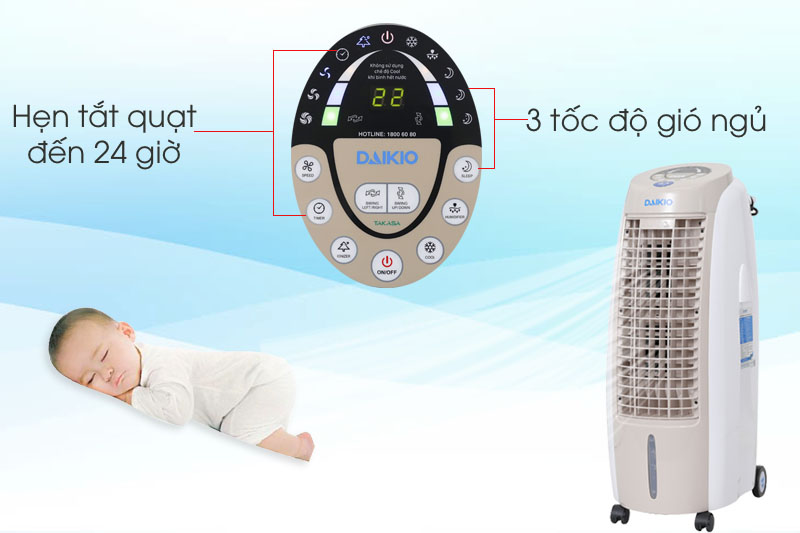 - Daikio DKA-01500B rất thích hợp trong mọi điều kiện sử dụng. Máy có 3 tốc độ quạt (thấp - trung bình - cao) và 2 chế độ gió (tiêu chuẩn - yên lặng khi ngủ) rất tiện lợi. Theo nghiên cứu, thì đây là sản phẩm có độ ồn thấp với dòng sản phẩm máy làm mát. Chế độ này còn giúp điều chỉnh nhiệt độ, độ ẩm vào ban đêm về mức tốt cho sức khỏe người dùng.
