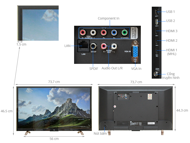 Tivi TCL hỗ trợ kết nối linh hoạt với điện thoại, máy tính, đầu đĩa, dàn máy, máy ảnh… thông qua các cổng kết nối phổ biến: