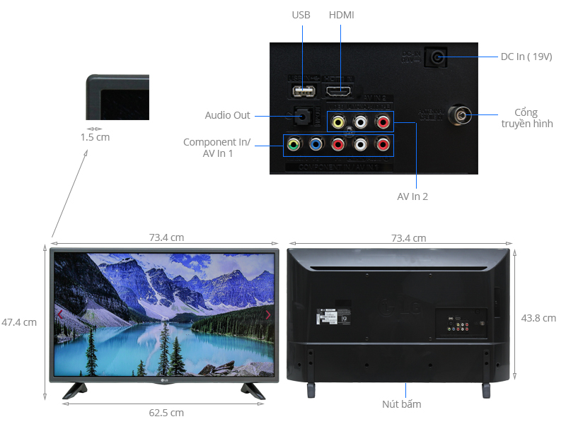 Tivi Led LG 32LH512D trang bị đầy đủ kết nối: HDMI, AV, HP OUT, USB, Component bạn có thể xem phim, nghe nhạc, xem hình ảnh trên màn hình lớn một cách nhanh và thuận tiện nhất.