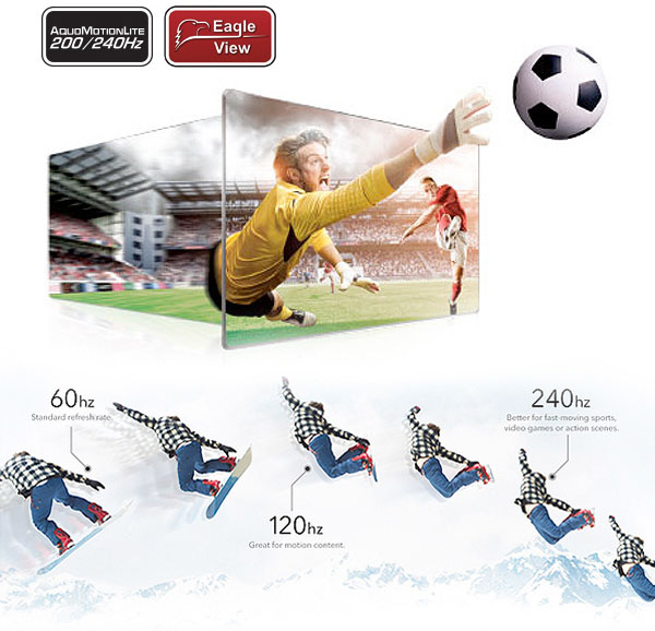 - Tần số quét AquoMotionLite 200/240 giảm thiểu tối đa hiện tượng nhòe hình, bóng ma do đường truyền kém chất lượng, đặc biệt là các hình ảnh chuyển động nhanh. Nâng cấp, cải thiện chất lượng hình ảnh, đem lại cho bạn trải nghiệm hình ảnh mượt mà rõ nét.